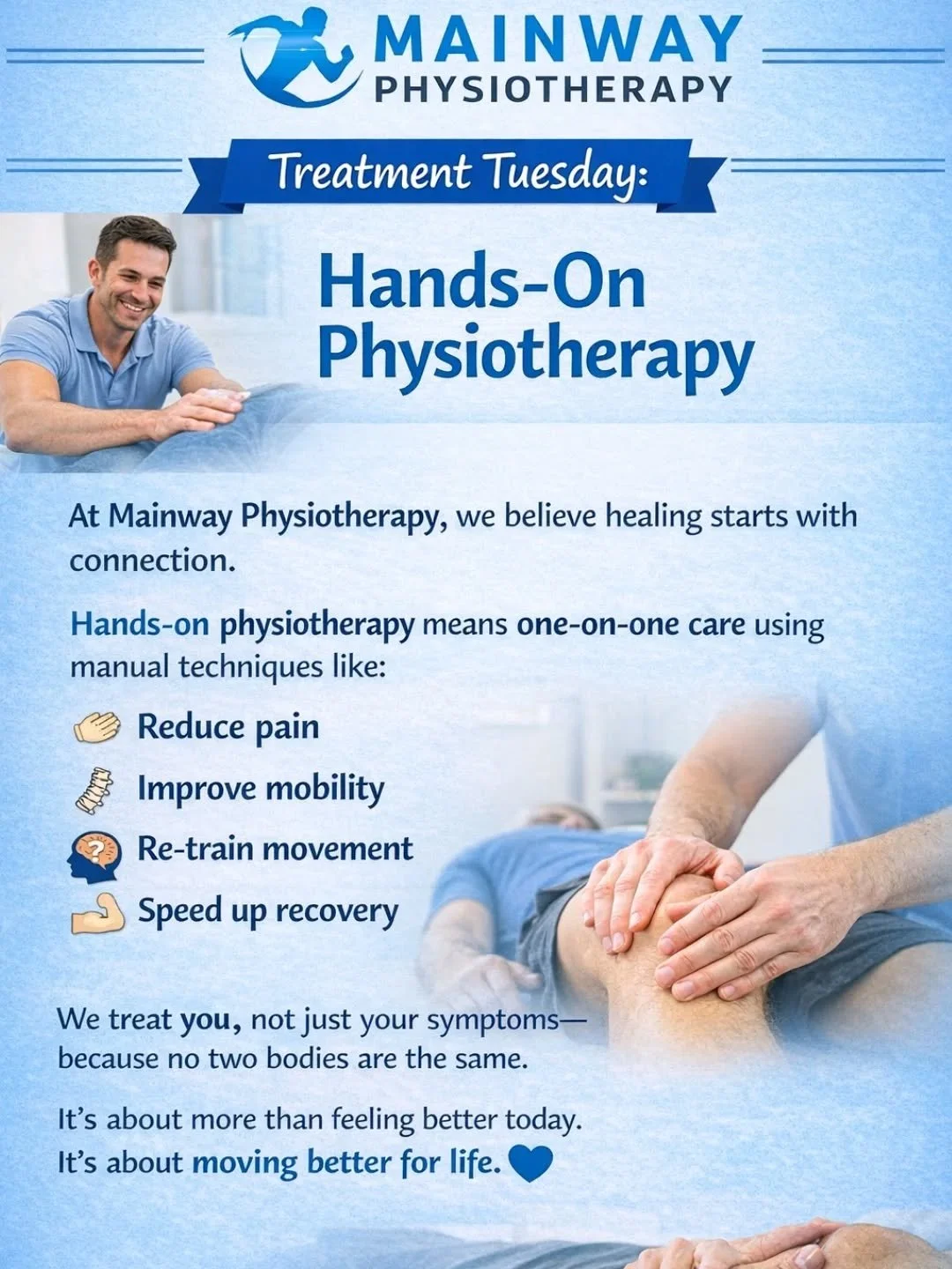 Located in Burlington, Ontario, Mainway Physiotherapy is a team of Registered healthcare practitioners trained in treating various injuries and chronic conditions. We offer Physiotherapy, Sports Therapy, Massage Therapy, and custom bracing by Bauerfeind or Donjoy. Our clinic offers individualized assessments based on client-centered goals so that you can live an active, pain-free lifestyle. Mainway Physiotherapy specializes in therapeutic Concussion Rehab, Pelvic Health, and Golf Injuries; our Therapists have completed training with the FITforeGOLF™ Association of Golf Injury Management and Titleist Performance Institute. Whether it’s recovery or prevention, Mainway Physiotherapy is focused on supporting clients to be stronger and to keep moving.