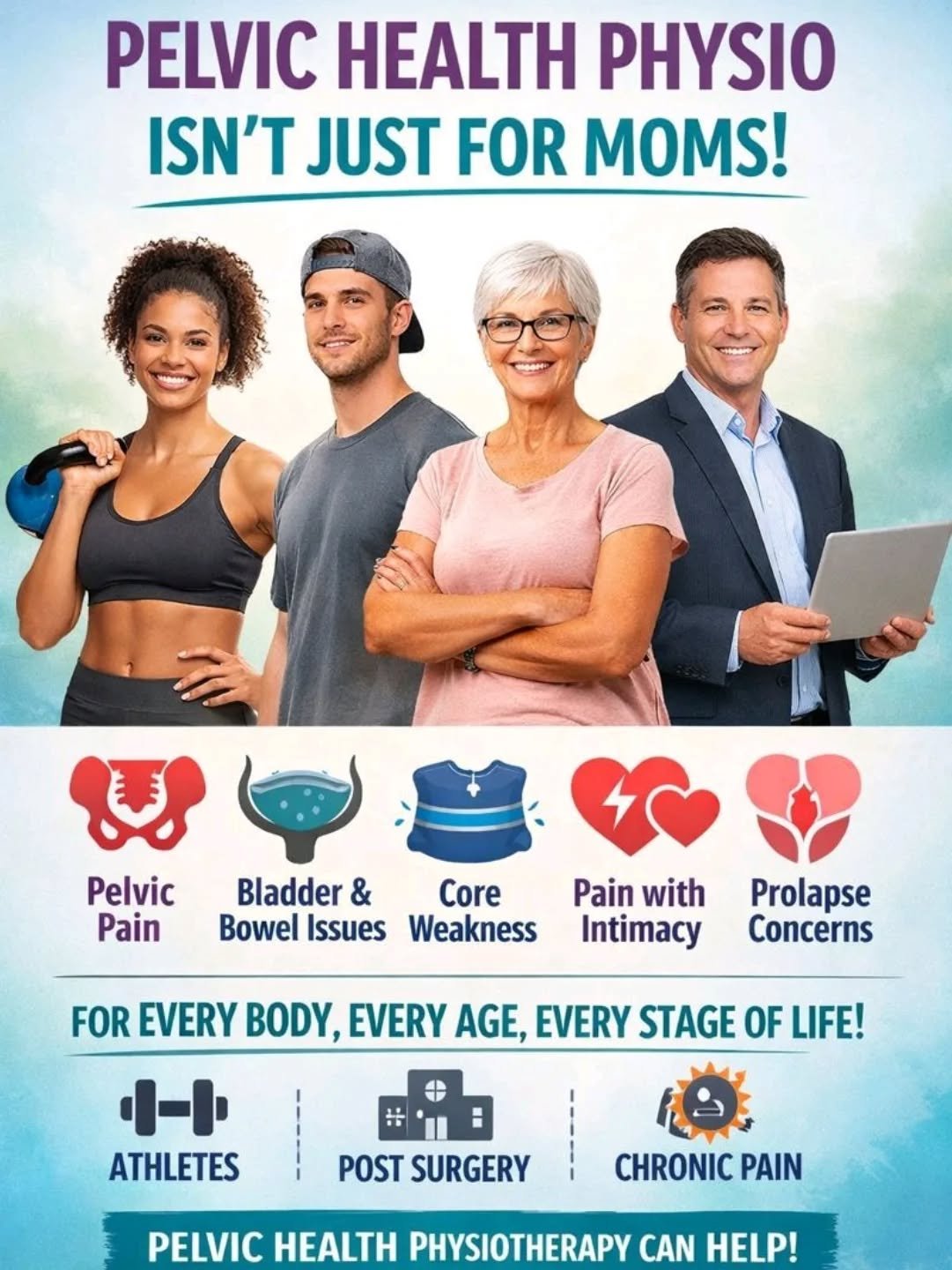 Pelvic Health Physiotherapy is valuable in treating pelvic floor dysfunction as a result of childbirth/pregnancy, pelvic surgery or trauma, chronic coughing or respiratory conditions, excess weight, hormonal changes, chronic straining or heavy lifting, and chronic constipation or diarrhea.